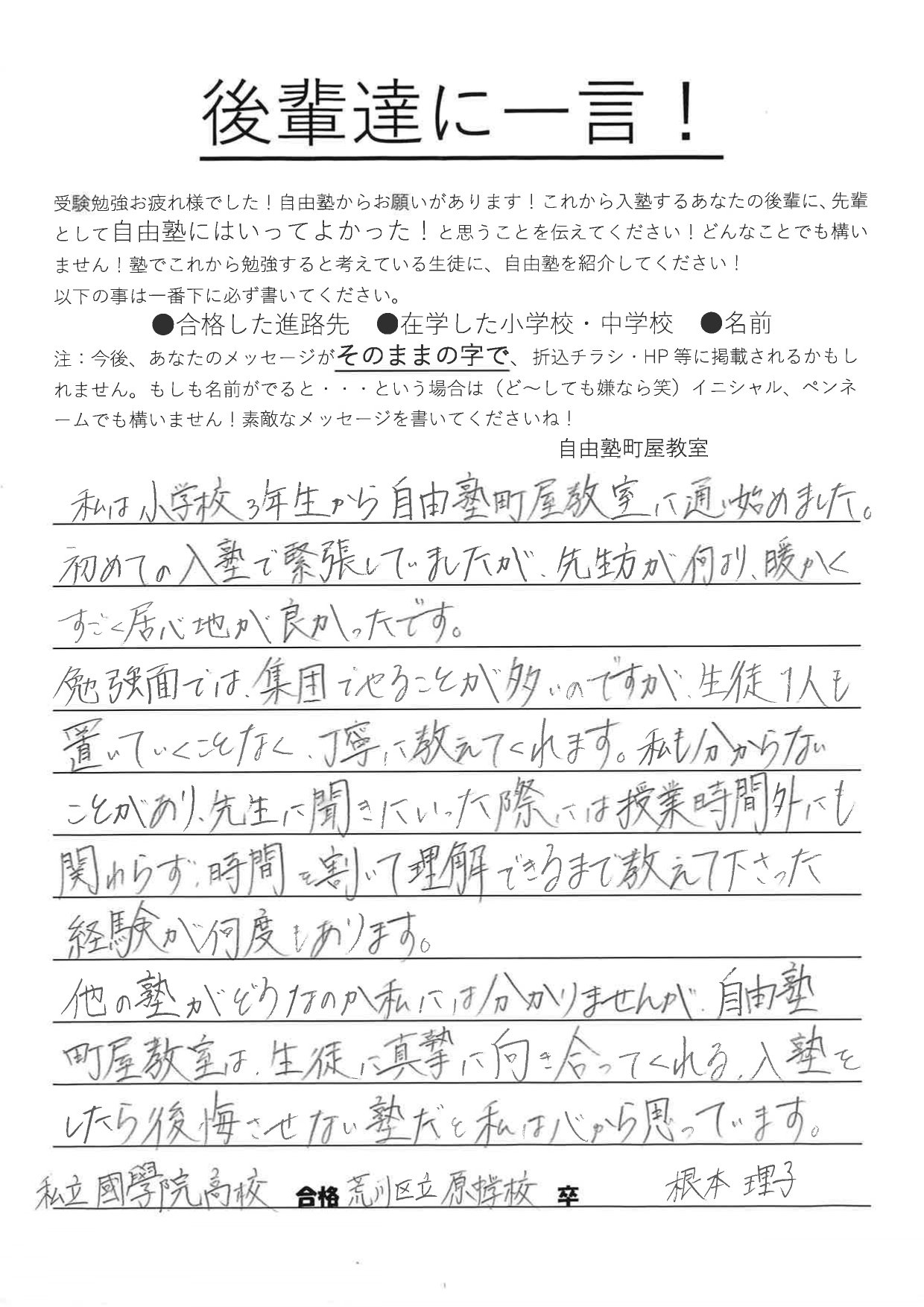 - 入塾をしたら後悔させない塾 私立國學院高校 合格 荒川区立原中学校 卒 根本 理子
