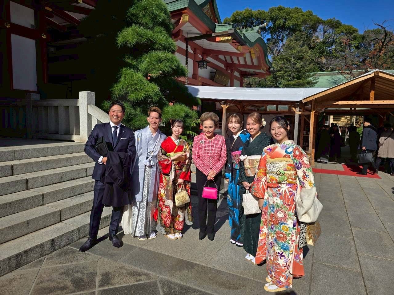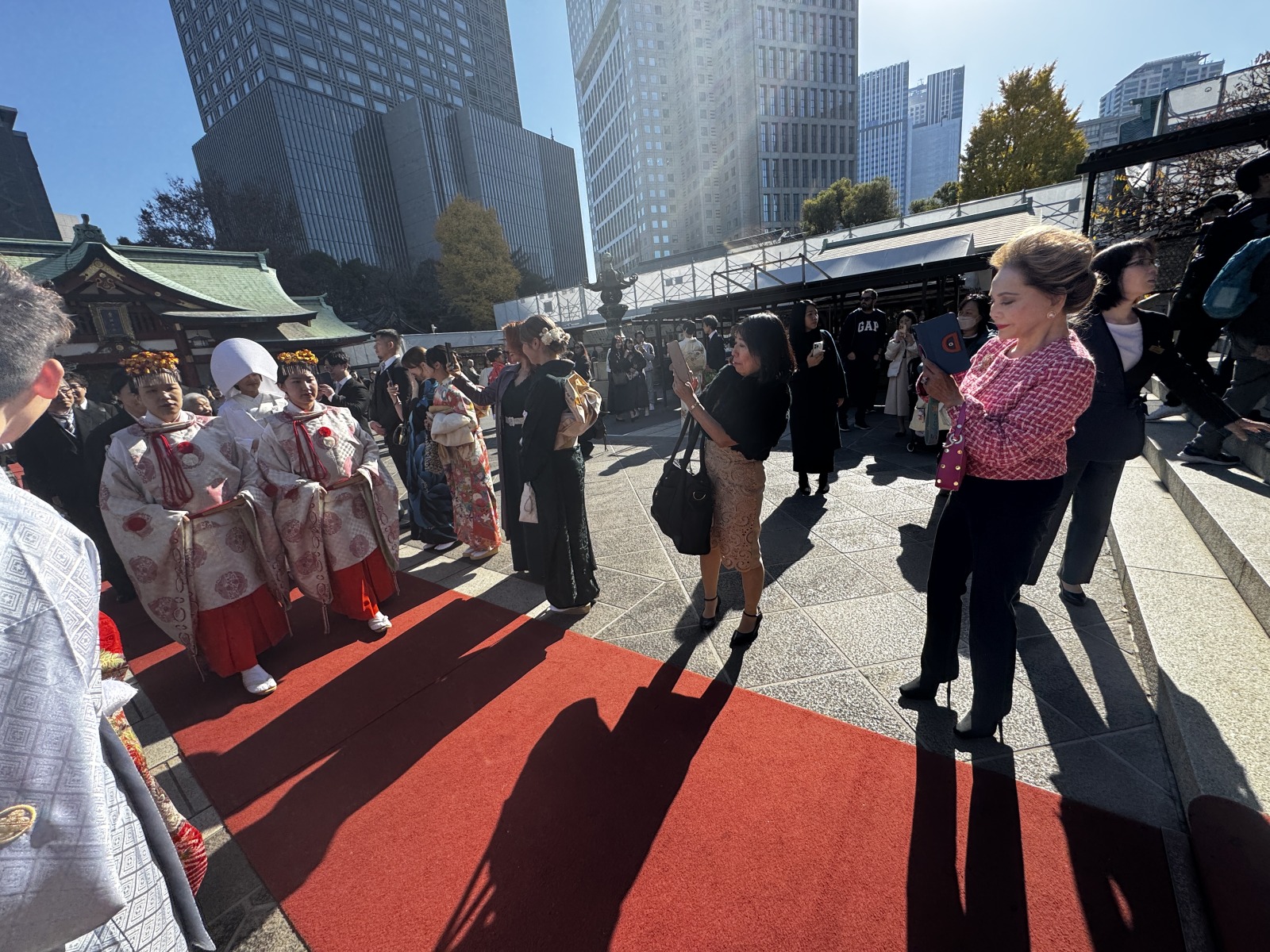 抜けるような晴天の中、赤坂日枝神社で神前式を行いました。沢山の参拝客も彼らのことをパシャパシャと写真撮っていたのですが、ん?その中に某芸能人もいるじゃあないですか笑。