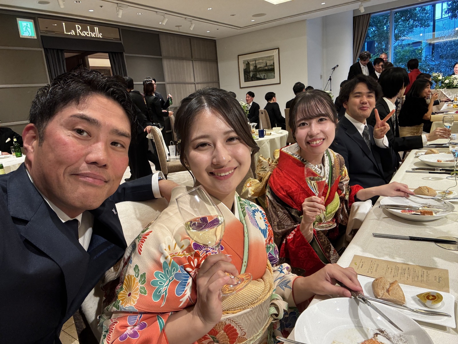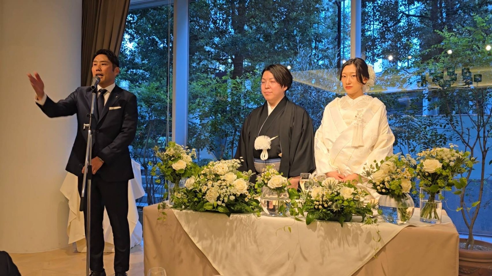 来賓の挨拶なし、乾杯の挨拶のみ。新郎直属の上司で所属会社社長、新婦元担任ということでブラボー氏が乾杯の挨拶をすることに。