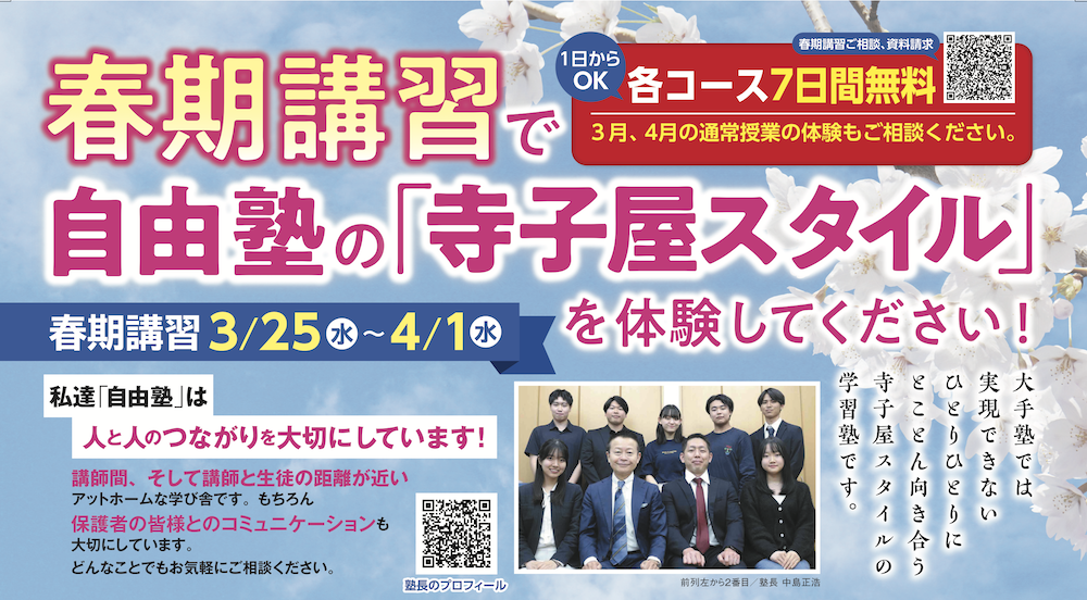 春期講習全日程(7日間)無料(自由塾が初めての方)