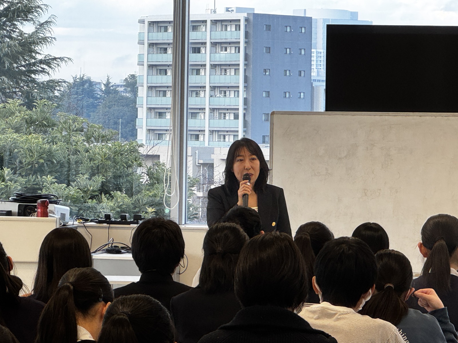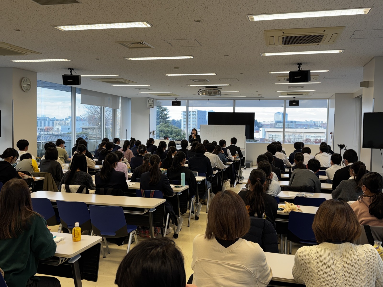 保護者も見つめる中・多くの学生の前で授業をするヨシザワ教務主任