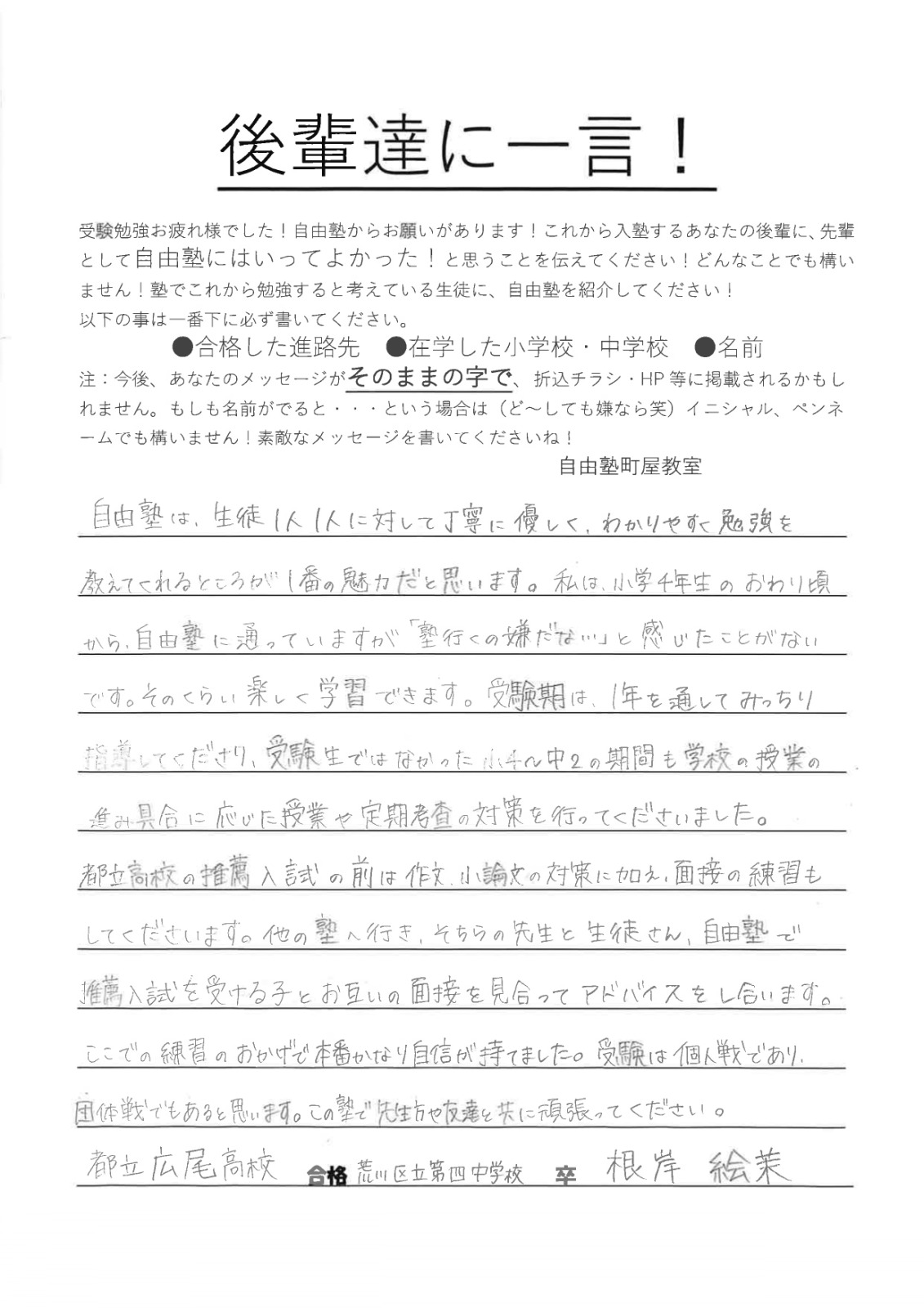 - 「塾行くの嫌だな」と感じたことがないです 都立広尾高校合格 荒川区立第四中学校根岸絵茉