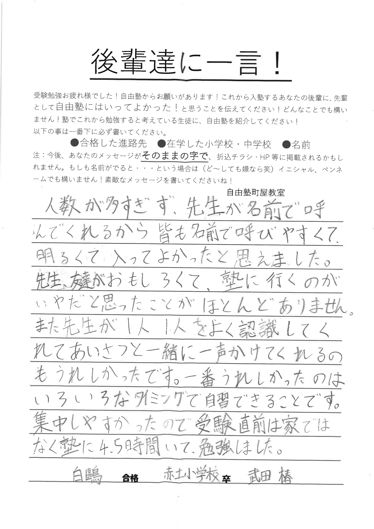 - 受験直前は家ではなく塾に4.5時間いて、勉強しました。 都立白鷗高校附属中学校合格 赤土小卒 武田椿